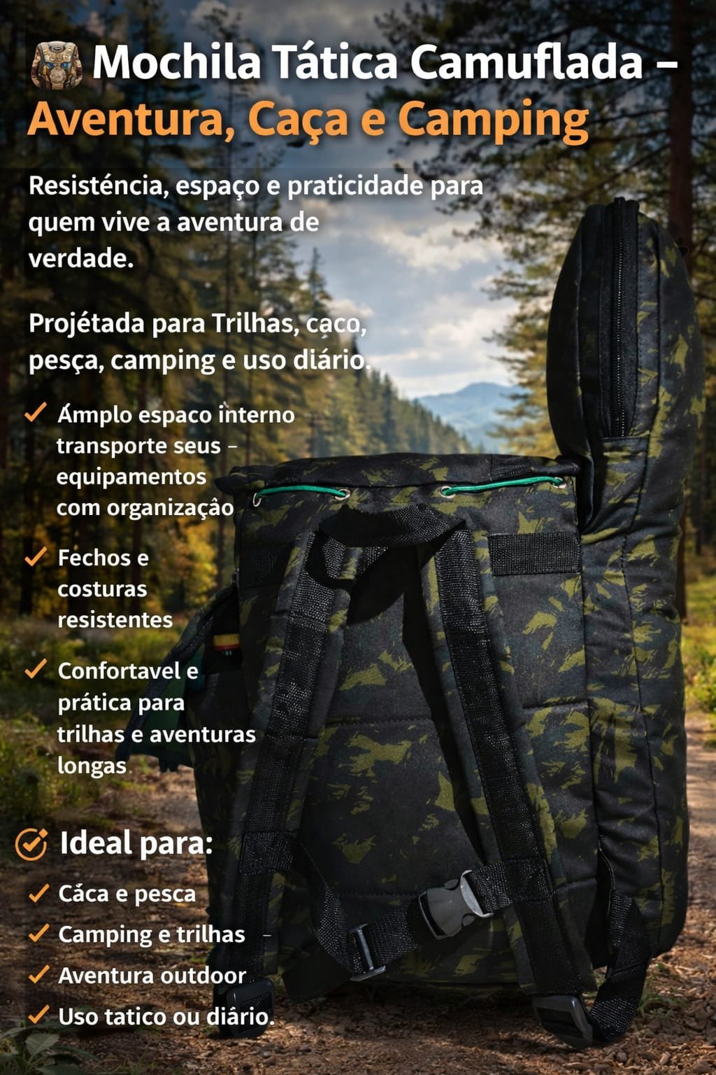 Cor/Estampa: Camuflada (ideal para ambientes naturais)
